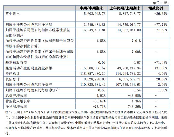 報告期內公司營業(yè)收入5,602,942.76元,較上年同期下降36.67%,利潤總額為4,512,587.70元,較上年同期下降76.39%,凈利潤為3249,481.81元,較上年同期下降77.71%?。