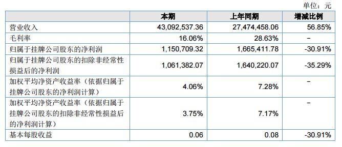 報(bào)告期內(nèi),公司實(shí)現(xiàn)營業(yè)收入43,092,537.36元,同比增長56.85%,實(shí)現(xiàn)凈利潤1,150,709.32元,同比減少30.91%。公司總資產(chǎn)68,748,556.67元,較期初增長了2.00%;公司總負(fù)債39,853,982.25元,較期初增加了0.50%;公司凈資產(chǎn)為28,894,574.42元,較期初增長了4.15%。?