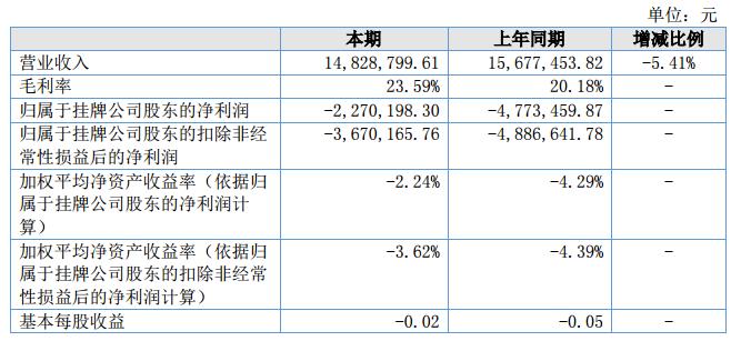 報(bào)告期內(nèi),公司營(yíng)業(yè)收入14,828,799.61元,較上年同期的15,677,453.82元減少848,654.21元,降幅5.41%;公司凈利潤(rùn)為虧損2,270,198.30元,較上年同期虧損4,773,459.87元減少虧損2,503,261.57元,變?