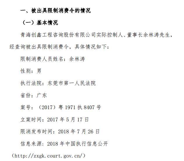 截止目前余林濤正在積極推動協(xié)調(diào)工作,爭取向法院申請撤銷被 納入限制消費(fèi)人員名單。創(chuàng)鑫咨詢將督促工作進(jìn)度,及時向投資者通報進(jìn) 展情況,維護(hù)公司股東合法權(quán)益。