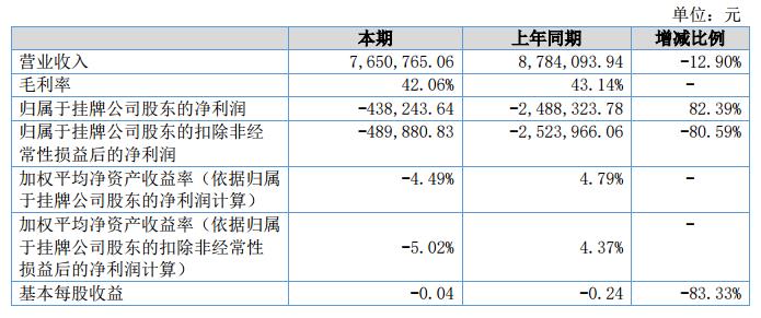 報告期內(nèi)實現(xiàn)營業(yè)收入7,650,765.06元,較去年同期營業(yè)收入8,784,093.94元,下降1,133,328.88元,歸屬于掛牌公司凈利潤-438,243.64元,相比去年凈利潤-2,488,323.79元減少2,050,080.15元,經(jīng)營活動產(chǎn)生的現(xiàn)金流量凈額為-2,309,556.75元。?