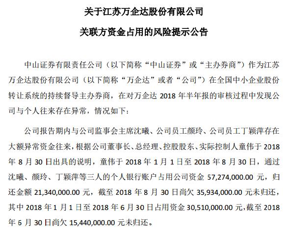 主辦券商中山證券表示,在對(duì)萬(wàn)企達(dá) 2018 年半年報(bào)的審核過(guò)程中發(fā)現(xiàn)公司與個(gè)人往來(lái)存在異常,才發(fā)現(xiàn)巨額資金占用的。