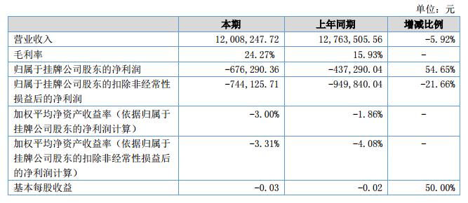 報告期內(nèi),財務狀況、經(jīng)營成果的情況:2018年上半年,公司實現(xiàn)營業(yè)收入12,008,247.72元,較上年同期12,763,505.56元,降低5.92%;銷售毛利率24.27%,較上年同期15.93%,增加8.34%。凈利潤-676,290.36元,較上年同期-437,290.04元,降低54.65%。?