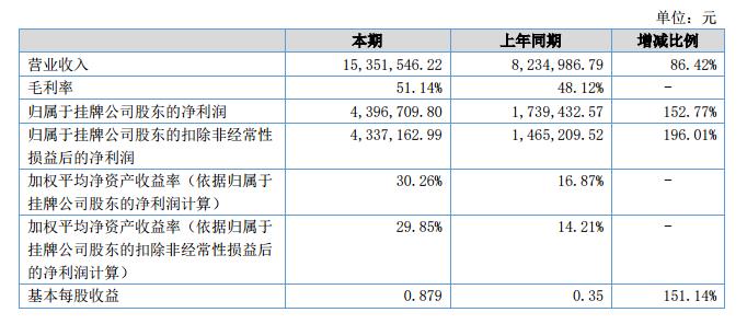 2018年上半年營業(yè)收入:15,351,546.22元;2017年上半年營業(yè)收入:8,234,986.79元,相比增長:86.42%;報告期內(nèi)凈利潤4,396,709.80元;上年同期:1,739,432.57元;增減比例:152.77%。?