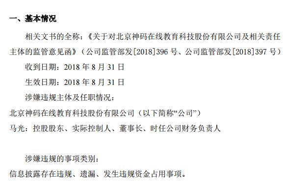 挖貝網(wǎng) 9月4日消息 ,新三板掛牌神碼在線(834748) 控股股東、實(shí)際控制人、董事長馬光因信息信披違規(guī)、遺漏、違規(guī)占用資金,被全國股轉(zhuǎn)公司出具監(jiān)管意見函。