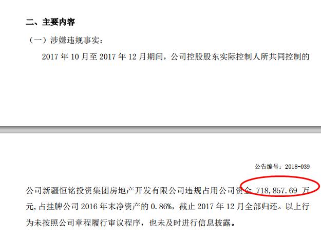 據(jù)介紹,2017年10月至2017年12月期間,公司控股股東實(shí)際控制人所共同控制的公司新疆恒銘投資集團(tuán)房地產(chǎn)開(kāi)發(fā)有限公司違規(guī)占用公司資金718,857.69元,占掛牌公司 2016 年末凈資產(chǎn)的 0.86%,截止 2017 年 12 月全部歸還。以上行為未按照公司章程履行審議程序,也未及時(shí)進(jìn)行信息披露。