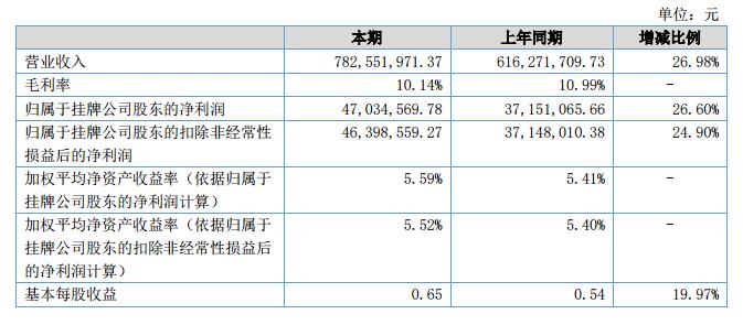 公司在報告期內的營業(yè)收入為78,255.20萬元,同比增長26.98%;營業(yè)總成本為72,751.06萬元,同比增長26.86%;歸屬母公司的凈利潤為4,703.46萬元,同比增長26.60%。?