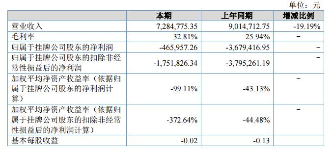 報告期公司營業(yè)收入728.48萬元,較上年同期減少172.99萬元,同比下降19.19%;歸屬于母公司所有者的凈利潤為-46.60萬元,較上年同期減虧321.35萬元。?