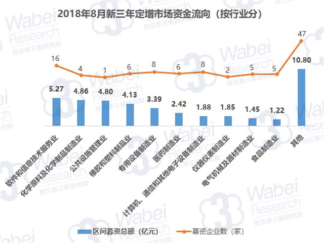 上月,新三板定增市場上,吸引資金最多的行業(yè)是軟件和信息技術(shù)服務(wù)業(yè),共募資5.27億元;其次是化學(xué)原料及化學(xué)制品制造業(yè),募資4.86億元。另外,募資金額超4億元的行業(yè)還有公共設(shè)施管理業(yè)、橡膠和塑料制品業(yè),分別募資4.80億元、4.13億元。