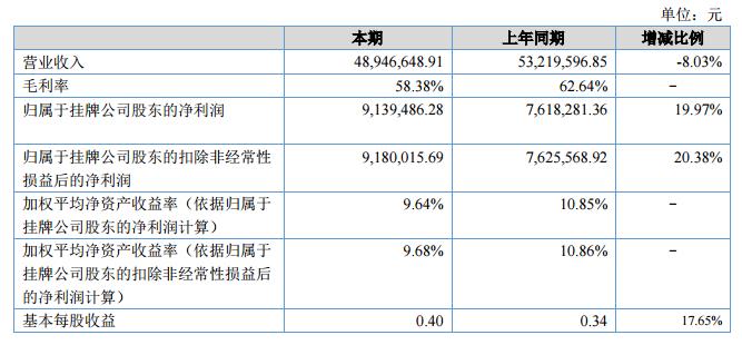 報告期內,公司實現(xiàn)營業(yè)收入48,946,648.91元,同比下降8.03%,主要原因為截至報告期末部分服務尚未完成,加盟商支付的預收賬款尚未達到收入確認條件;實現(xiàn)凈利潤9,139,486.28元,同比增長19.97%,主要原因為銷售費用中的廣告宣傳費較去年同期有所下降。?
