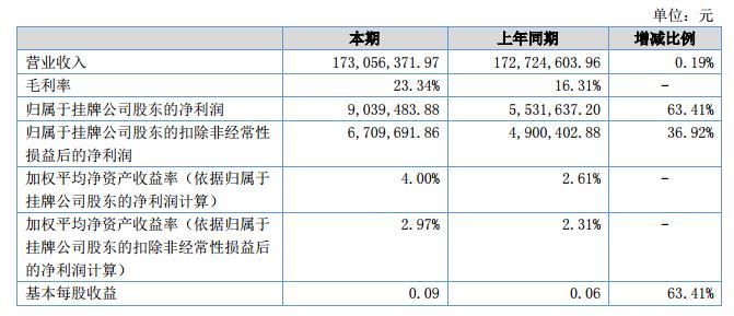 報(bào)告期內(nèi),公司實(shí)現(xiàn)營(yíng)業(yè)收入173,056,371.97元,較上年同期增長(zhǎng)0.19%;營(yíng)業(yè)成本132,663,325.27元,較上年同期減少8.23%;實(shí)現(xiàn)凈利潤(rùn)9,039,483.88元,較上年同期增長(zhǎng)63.41%。?