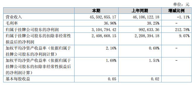 報告期內(nèi)營業(yè)收入4,559萬元,比上年同期下降1.11%;營業(yè)成本2,874萬元,比上年同期上升0.95%;凈利潤為310萬元,比上年同期增長559.43%;凈資產(chǎn)收益率為2.16%,同比上升1.48個百分點。?