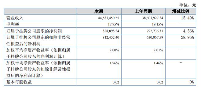 報(bào)告期內(nèi)公司實(shí)現(xiàn)銷(xiāo)售收入44,583,450.55元,較上年同期的38,603,927.34元增加5,979,523.21元,增加15.49%。公司2018年上半年和2017年上半年分別實(shí)現(xiàn)凈利潤(rùn)828,898.34元和792,736.37元,同比增加4.56%。?
