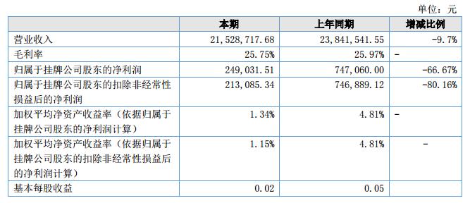 報(bào)告期內(nèi)公司實(shí)現(xiàn)營(yíng)業(yè)收入21,528,717.68元,較上年同期減少9.70%;凈利潤(rùn)金額228,899.04元,較上年同期減少67.53%。