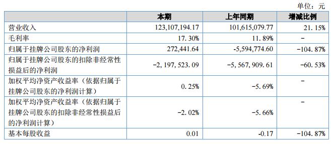 報告期內(nèi),公司上半年實現(xiàn)營業(yè)收入12,310.72萬元,較上年同期增長21.15%;公司凈利潤為27.24萬元,較上年同期上升104.84%。?