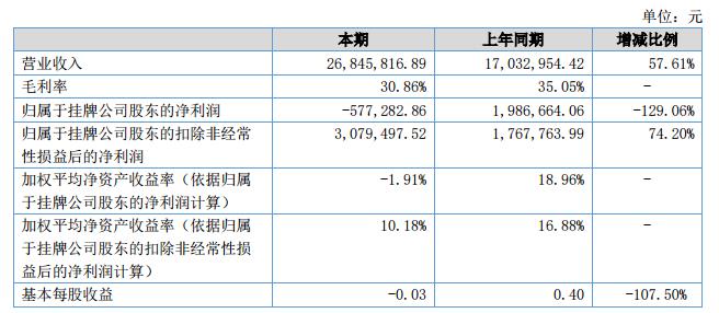 報告期公司營業(yè)收入26,845,816.89元,同比增長57.61%。本期歸屬于掛牌公司股東的凈利潤為-577,282.86元,同比下降129.06%,主要系股份支付確認(rèn)管理費用所致。?