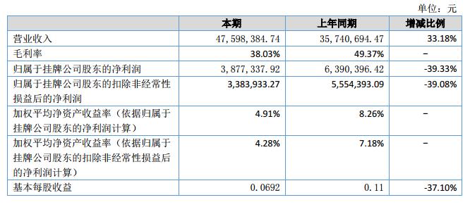 報告期內(nèi),公司實現(xiàn)營業(yè)收入 47,598,384.74 元,較上年同期增長 33.18%;凈利潤 3,877,337.92 元,較上年同期的 6,390,396.42 減少了 39.33%。?