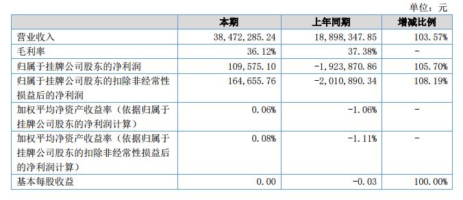報(bào)告期內(nèi)公司營(yíng)業(yè)收入達(dá)到38,472,285.24元,較2017年度同期增長(zhǎng)103.57%;凈利潤(rùn)實(shí)現(xiàn)109,575.10元,較2017年度同期增長(zhǎng)105.70%。?