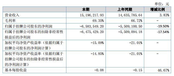 報告期內(nèi)公司共實現(xiàn)營業(yè)收入15,196,217.93元,較上年同期(14,635,785.64元)增長3.83%;公司凈利潤為-6,613,515.47元,較上年同期(-5,551,015.87元)減少19.14%。?