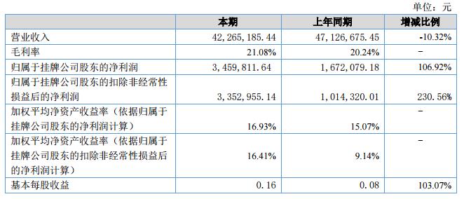 公司在報(bào)告期內(nèi)實(shí)現(xiàn)營(yíng)業(yè)收入4,226.52萬(wàn)元,綜合毛利率21.08%,凈利潤(rùn)334.70萬(wàn)元,歸屬于掛牌公司股東的凈利潤(rùn)為345.98萬(wàn)元,歸屬于掛牌公司股東扣除非經(jīng)常性損益凈利潤(rùn)為335.30萬(wàn)元,報(bào)告期末總資產(chǎn)7,605.56萬(wàn)元,總負(fù)債4,854.64萬(wàn)元,期末結(jié)存貨幣資金609.26萬(wàn)元。?