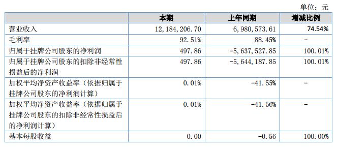報告期內(nèi),公司實現(xiàn)營業(yè)收入1,218.42萬元,比上年同期增長74.54%。2018年上半年,企業(yè)實現(xiàn)歸屬于掛牌公司股東的凈利潤為0.05萬元,比上年同期增長100.01%;截至2018年6月30日,公司注冊資本1,000萬元,資產(chǎn)總額為368.64萬元,負(fù)債總額732.29萬元,凈資產(chǎn)-363.65萬元。?