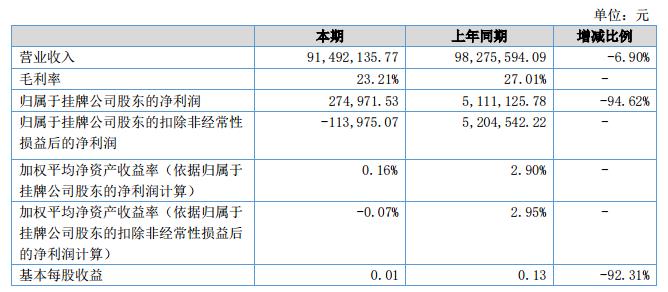 報(bào)告期內(nèi)公司總資產(chǎn)305,763,876.15元,同比增長14.74%,歸屬于掛牌公司凈資產(chǎn)168,238,681.42元,同比上年增長-0.20%。報(bào)告期內(nèi)實(shí)現(xiàn)銷售收入91,492,135.77元,同比上年下降-6.90%,歸屬于掛牌公司股東的凈利潤274,971.53元,同比增長-94.62%。?