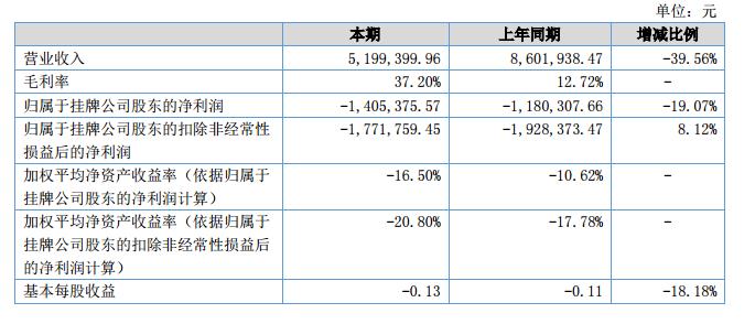 報告期內(nèi),公司實現(xiàn)營業(yè)收入 519.94 萬元,比上年同期下降 39.56%;業(yè)務(wù)成本 709.97 萬元,比上 年同期下降 32.33%;實現(xiàn)歸屬于掛牌公司股東的凈利潤-140.54 萬元,比上年同期下降 19.07%。經(jīng)營活 動產(chǎn)生的現(xiàn)金流量凈額-56.86 萬元,較上年同期增加 181.18 萬元。?