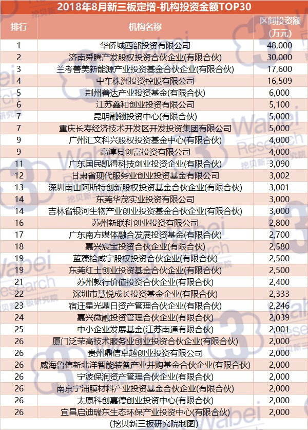 附:2018年8月新三板定增-機(jī)構(gòu)投資金額TOP30