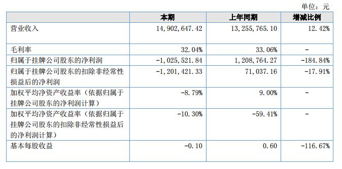 報(bào)告期內(nèi)公司實(shí)現(xiàn)營業(yè)收入14,902,647.42元,較上年同期增長12.43%;報(bào)告期內(nèi)實(shí)現(xiàn)凈利潤-1,003,939.21元,比上年同期下降了180.74%。