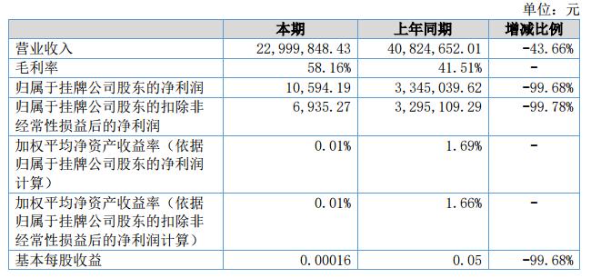 報告期內營業(yè)收入22,999,848.43元,較上年同期40,824,652.01元,下降了43.66%;營業(yè)成本23,358,283.48元,較上年同期38,469,896.48元,下降了39.28%;歸屬于掛牌公司股東的凈利潤為10,594.19元,較上年同期3,345,039.62元,下降了99.68%。?
