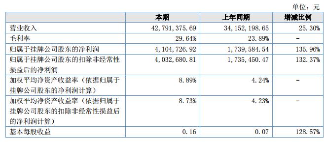 報告期內(nèi)公司營業(yè)收入為4,279.14萬元,較上年同期增長25.30%;營業(yè)成本3,010.66萬元,較上年同期僅增長15.82%;凈利潤為410.47萬元,較上年同期增長135.96%。
