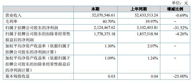 報告期內(nèi)公司實(shí)現(xiàn)營業(yè)收入52,070,546.61元,同比下降0.69%;實(shí)現(xiàn)凈利潤1,781,319.50元,同比下降26.45%。?