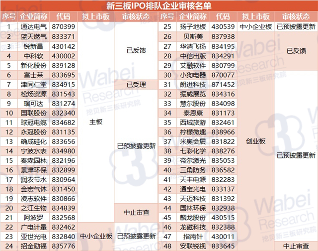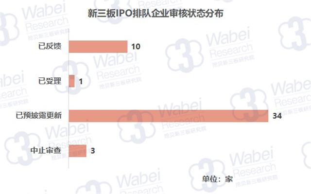 新三板IPO排隊(duì)企業(yè)共計(jì)48家,其中,已反饋企業(yè)10家,已受理企業(yè)1家,已預(yù)披露更新企業(yè)34家,中止審查企業(yè)3家。