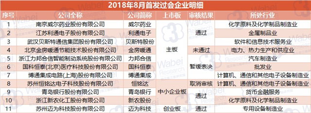 2018年8月,首發(fā)上會(huì)的企業(yè)共11家。最終,6家過會(huì),過會(huì)率55%。另外,未過會(huì)的企業(yè)中,1家被否,3家暫緩表決,1家取消審核。