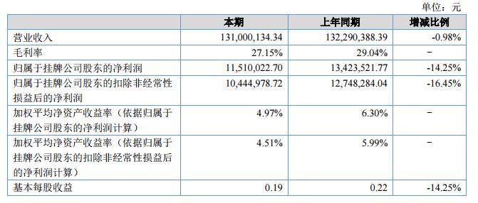 報(bào)告期內(nèi)公司實(shí)現(xiàn)營(yíng)業(yè)收入為131,000,134.34元,比上年度同期132,290,388.39元相比,下降0.98%;營(yíng)業(yè)成本95,429,256.13元,比上年同期93,872,025.15元相比,增加1.66%;實(shí)現(xiàn)凈利潤(rùn)11,449,043.10元,與去年同期13,346,613.18元相比,下降14.22%。?