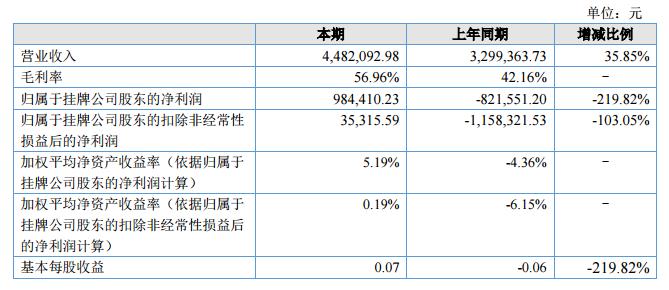 報告期內(nèi)公司實現(xiàn)營業(yè)收入4,482,092.98元,與去年同期比增長35.85%;凈利潤984,410.23元,同比增長219.82%。?