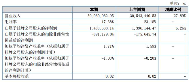 報告期內(nèi),公司的經(jīng)營狀況繼續(xù)穩(wěn)步發(fā)展,上半年實現(xiàn)營業(yè)收入39,060,962.95元,與上年同期相比增長27.89%;扣除非經(jīng)常性損益后的凈利潤-891179.04元,與上年同期相比減少715533.3元。?