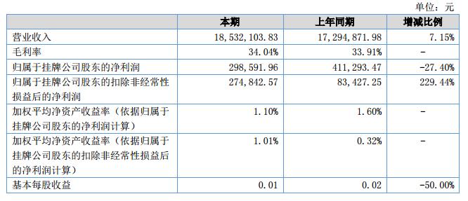 報(bào)告期內(nèi),公司實(shí)現(xiàn)營(yíng)業(yè)收入18,532,103.83元,同比增長(zhǎng)7.15%,扣非后凈利潤(rùn)274,842.57元,同比增長(zhǎng)229.44%%。營(yíng)業(yè)收入較上年同期有小幅度增長(zhǎng),利潤(rùn)剔除非經(jīng)常性損益的因素較上年增長(zhǎng)幅度較大。?