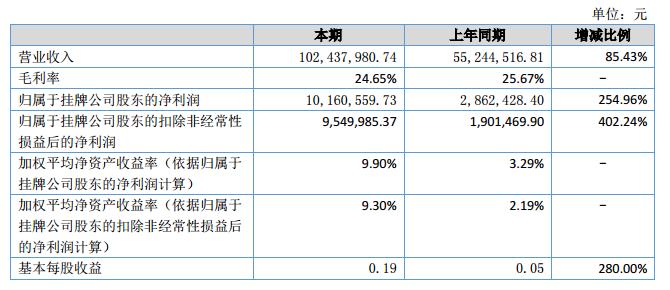 報告期內(nèi)公司實(shí)現(xiàn)營業(yè)收入10,243.80萬元,上年同期5,524.45萬元,同比增加4,719.35萬元,增幅85.43%;歸屬于掛牌公司股東的凈利潤1,016.06萬元,上年同期286.24萬元,歸屬于掛牌公司股東的凈利潤同比增加729.81萬元,增幅254.96%。?
