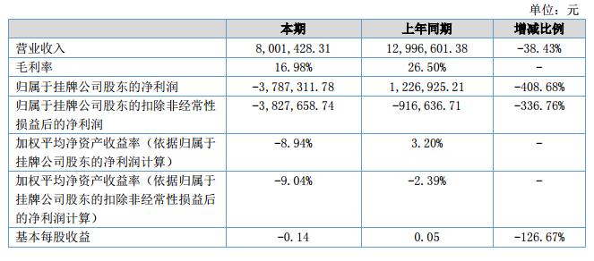 報(bào)告期內(nèi)公司主營(yíng)業(yè)務(wù)收入合計(jì)800.14萬(wàn)元,相比去年同期-38.43%;報(bào)告期內(nèi)實(shí)現(xiàn)凈利潤(rùn)-378.73萬(wàn)元,相比去年同期-408.68%,?