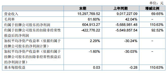 報告期內(nèi),公司營業(yè)收入15,297,769.52元,與上年同期營業(yè)收入9,017,227.09元相比較,增長了69.65%;凈利潤604,913.27元,與上年度同期相比凈利潤增長110.63%?