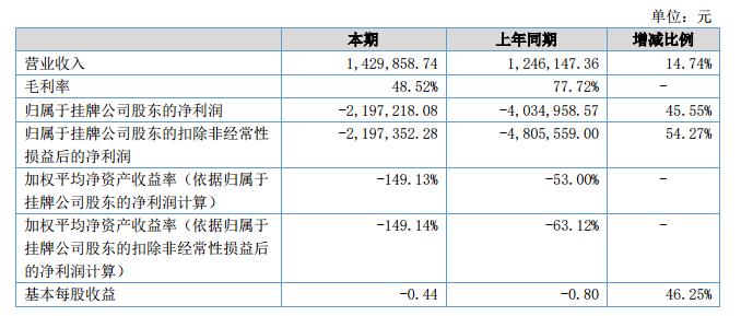 報告期內(nèi)公司營業(yè)收入1,429,858.74元,上年同期為1,246,147.36元,同比上升14.74%,共計增加183,711.38元;公司凈利潤-2,197,218.08元,上年同期為-4,034,958.57元,同比增加45.55%?