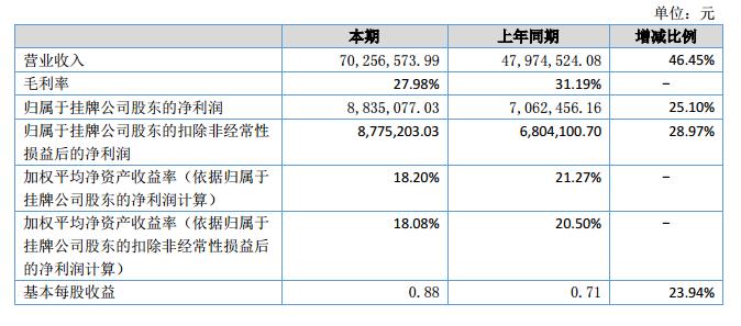 報告期內(nèi),公司實現(xiàn)營業(yè)收入70,256,573.99元,同比增長了46.45%。營業(yè)成本同比增長53.28%實現(xiàn)凈利潤8,835,077.03元,同比增長25.1%。?