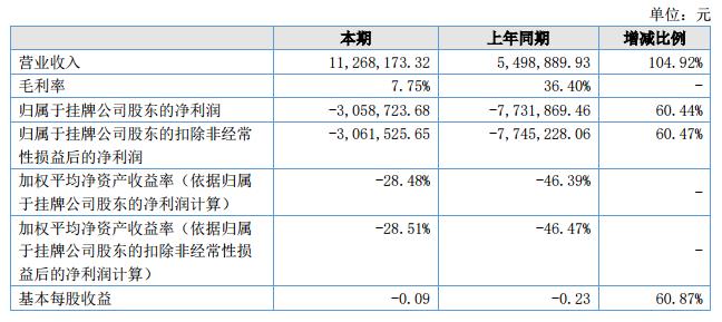 報告期內(nèi),公司實現(xiàn)營業(yè)收入11,268,173.32元,比去年同期增長104.92%;營業(yè)成本10,394,931.36元,比去年同期增長197.22%;凈利潤-3,058,723.68元,比去年同期增長60.44%;經(jīng)營活動產(chǎn)生的現(xiàn)金流量金額-2,076,237.89元,比去年同期增長72.29%。?