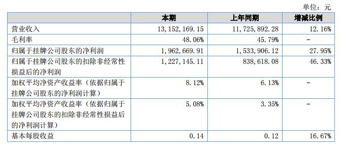 報(bào)告期,公司實(shí)現(xiàn)營(yíng)業(yè)收入13,152,169.15元,較上年同期增長(zhǎng)12.16%;報(bào)告期內(nèi),公司本期毛利率為48.06%,較上年同期小幅增長(zhǎng);報(bào)告期內(nèi),公司凈利潤(rùn)為1,962,669.91元,較上年同期增長(zhǎng)27.95%。