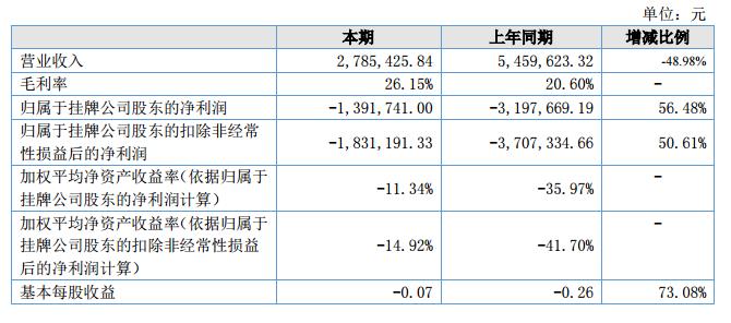 報(bào)告期內(nèi)公司實(shí)現(xiàn)營業(yè)收入2,785,425.84元,比上年同期5,459,623.32元減少2,674,197.48元,減少了48.98%;凈利潤-1,391,741.00元,與上年同期相比,雖然虧損減少,但仍然處于虧損狀態(tài)。?