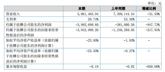 報(bào)告期內(nèi),公司實(shí)現(xiàn)營(yíng)業(yè)收入506.15萬元,較上年同期減少31.59%;營(yíng)業(yè)成本401.18萬元,較上年同期增加16.26%;毛利率為20.74%,同比降低32.62個(gè)百分點(diǎn);歸屬于掛牌公司股東的凈利潤(rùn)-399.27萬元,同比降低947.73%。