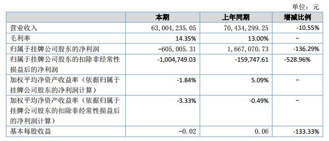 報告期內(nèi)公司實現(xiàn)營業(yè)收入6300.42萬元,同比減少10.55%;實現(xiàn)凈利潤66.17萬元,其中歸屬母公司股東的凈利潤-60.5萬元,同比減少136.29%。?