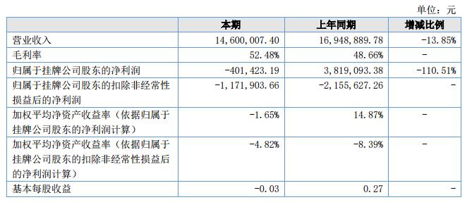 報(bào)告期內(nèi),公司的營(yíng)業(yè)收入為14,600,007.40元,較上年同期下降了2,348,882.38元;營(yíng)業(yè)成本6,937,783.46元,較上年同期下降了1,764,568.07元;凈利潤(rùn)-401,423.19元,較上年同期減少4,220,516.57元。