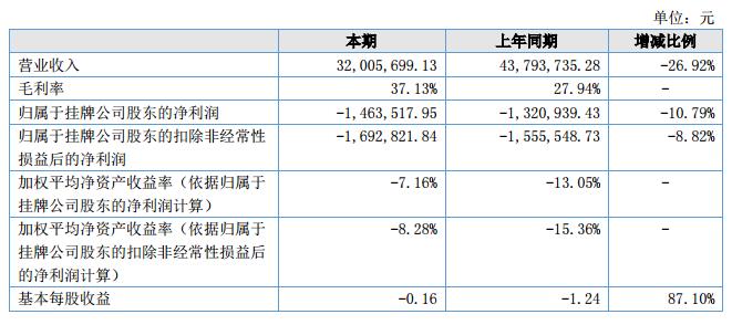 報告期內(nèi),公司實(shí)現(xiàn)營業(yè)收入3,200.57萬元,較上期下降26.92%;營業(yè)成本2,012.19萬元,較上期下降36.24%;凈利潤-131.82萬元,較上期增加20.81萬元。?